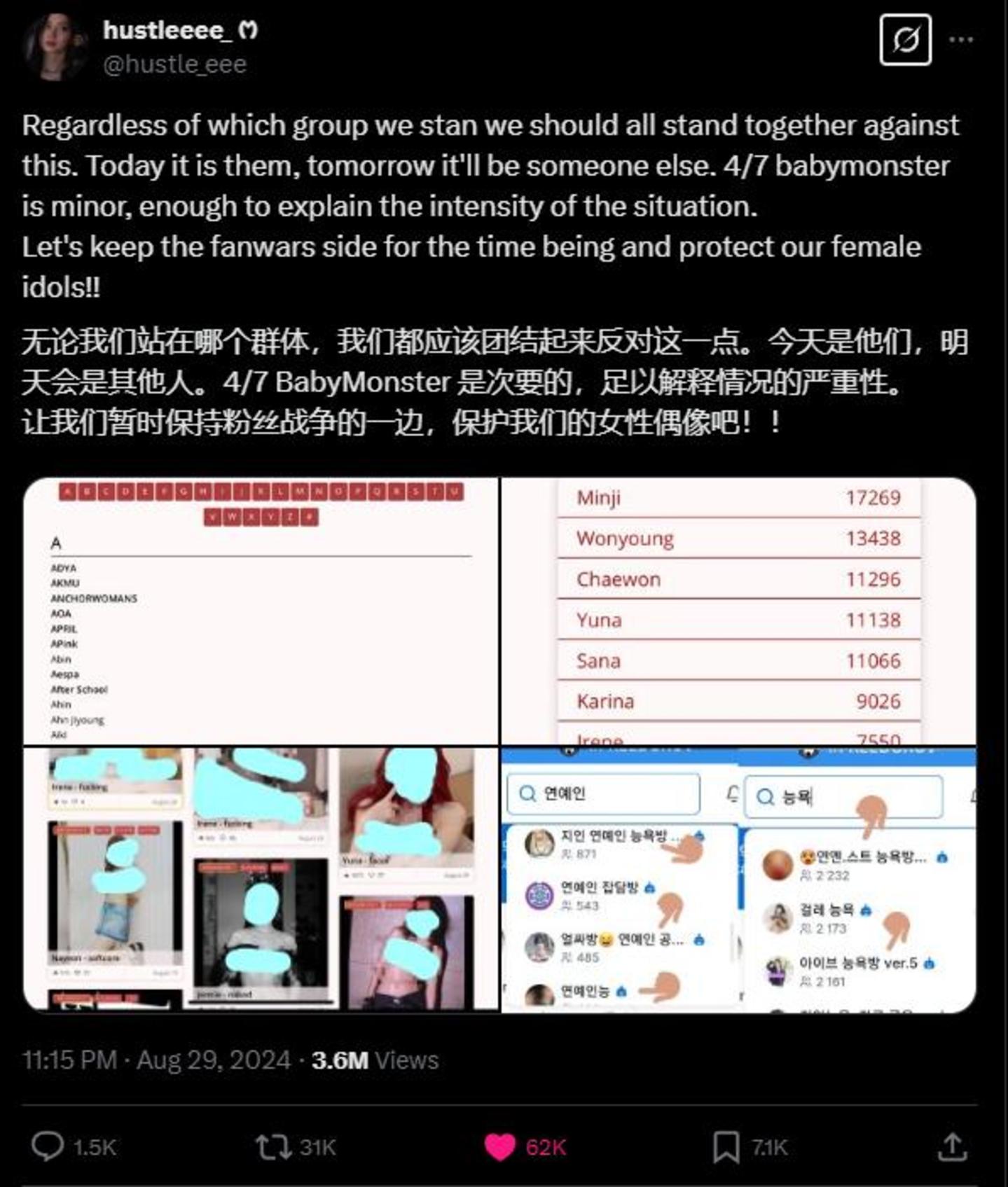 去年,YG旗下女团BABYMONSTER的粉丝群体在社交平台上发声,呼吁粉丝暂时放下饭圈纷争,共同保护女艺人。他们强调,大家无论支持哪个团体,现在都应团结一致,坚决反对深度伪造色情内容的行为,今天的受害者是她们,明天可能就是其他人。尤其是BABYMONSTER的7名成员中,有4人仍是未成年人,这足以说明问题的严重性。