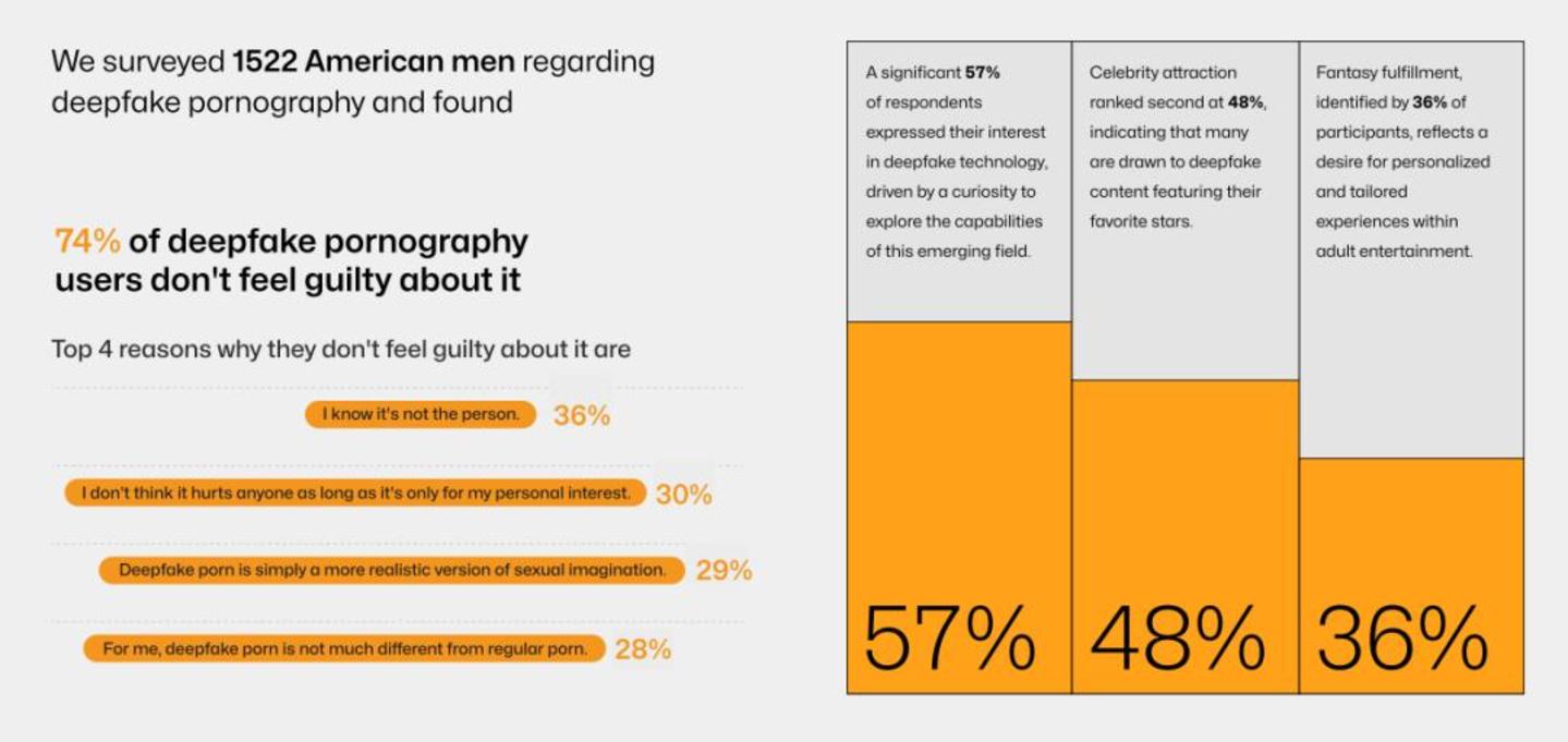 以Home Security Heroes的1522名美国男性受访者为例,74%的人对深度伪造色情内容没有罪恶感,其中“我知道这不是真人。”(36%)、“只是我个人兴趣,这不会伤害任何人。”(30%)“深度伪造色情只是更逼真的性幻想。”(29%)“深度伪造色情和普通色情没有太大区别。”(28%)