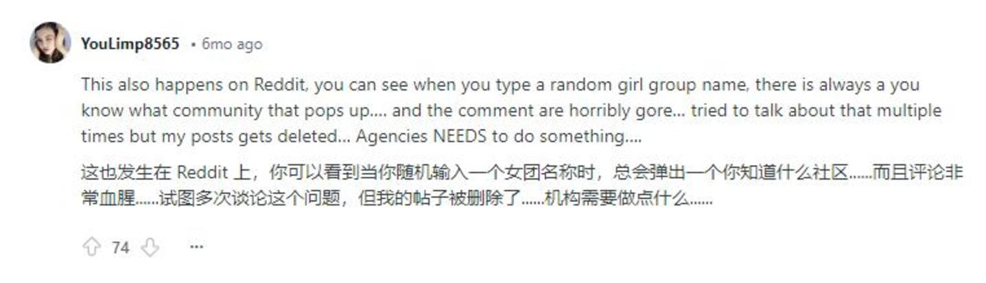 在海外社交媒体Reddit上,有网友指出当搜索“K-Pop”相关的关键词就会跳出热门subreddit(讨论社区)几乎都是18禁的话题,评论简直令人作呕。