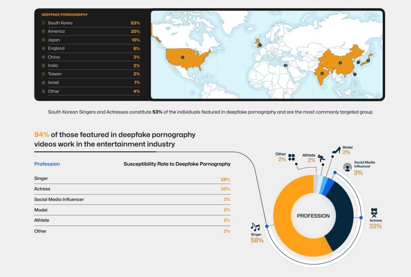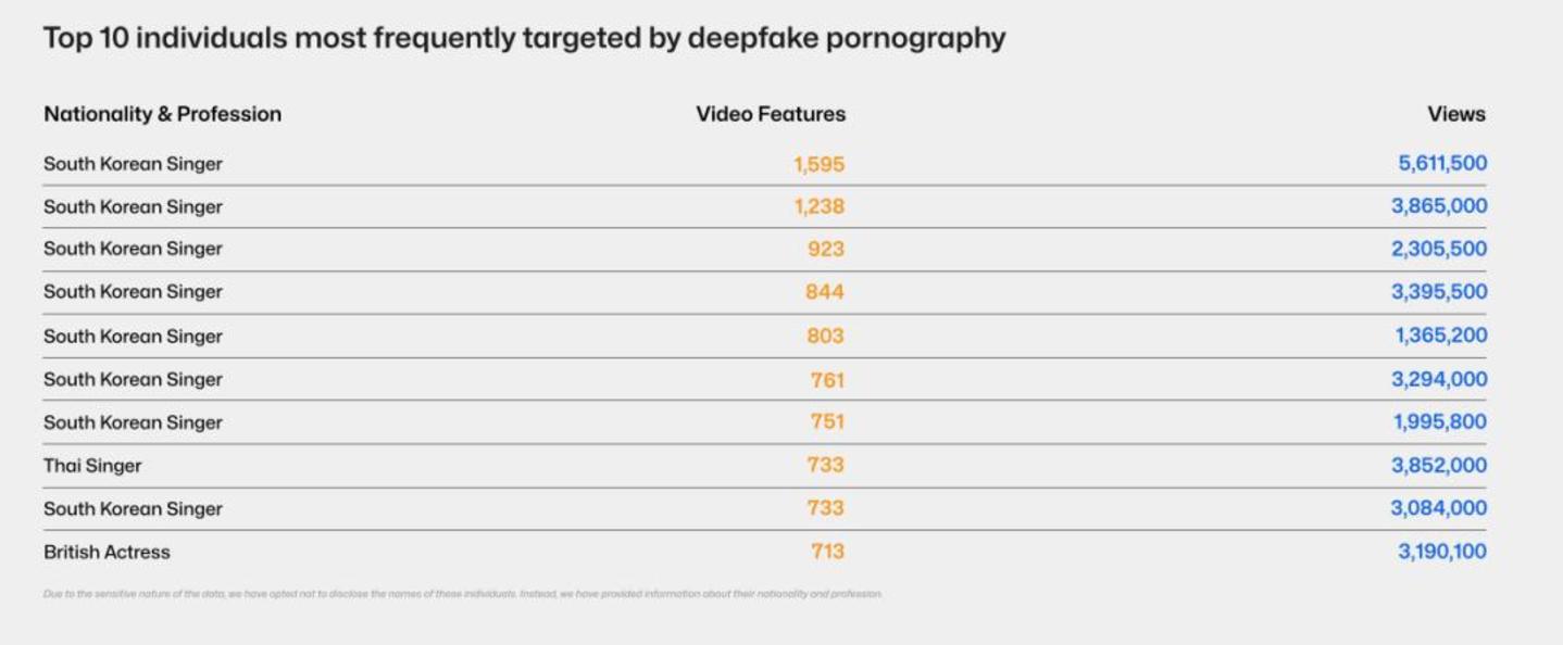 而在10 个深度伪造色情网站和85个视频共享平台上的近 9.6万个视频中,53% 的人是韩国歌手和演员。