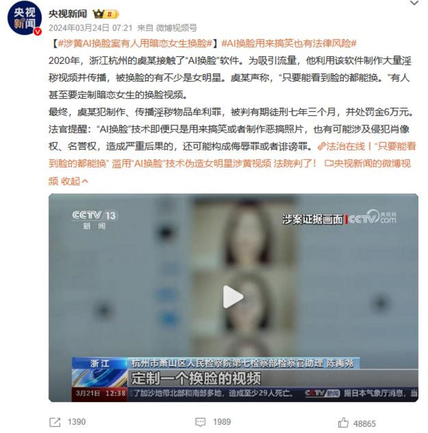 2020年,虞某一边通过传播换脸的淫秽视频来“吸粉引流”,同时通过出售“AI换脸”软件和提供所谓“AI换脸”的私人定制服务,在不到半年的时间里就获利数万元。2023年11月,杭州市萧山区人民法院判决虞某犯制作、传播淫秽物品牟利罪,判处有期徒刑七年三个月,并处罚金6万元。这也是我国首例关于“AI换脸”侵犯公民个人信息公益诉讼案的审理判决。