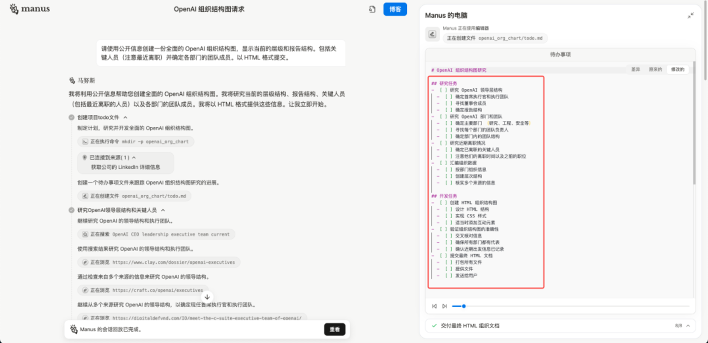 比如让 Manus 整理一份 OpenAI 的组织架构图,它不会直接去贸然干这个事儿,而是会先进行一个任务拆解,来明确,做好这个事情,都需要哪些具体的细致的步骤,然后根据自己拆解的步骤,再逐项自动执行任务,最终产出用户“直接可用”的结果。