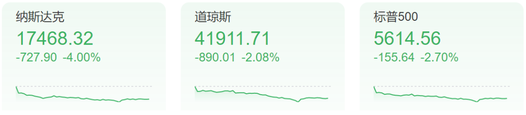 截至收盘,道指跌890.01点,跌幅2.08%,报41911.71点,纳指跌4.00%,创2020年3月以来最大跌幅,报17468.32点,标普500指数跌2.70%,报5614.56点。