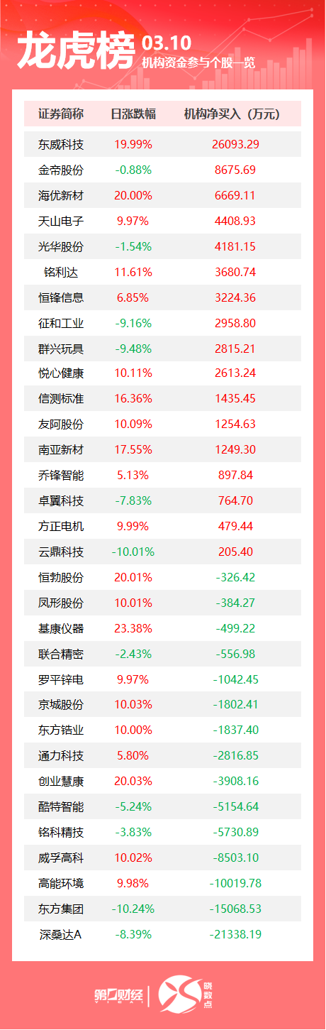 3月10日龙虎榜中,共32只个股出现了机构的身影,17只股票呈现机构净买入,15只股票呈现机构净卖出。当天机构净买入前三的股票分别是东威科技、金帝股份、海优新材。当天机构净卖出前三的股票分别是深桑达A、东方集团、高能环境。