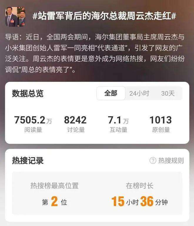 3月5日,全国人大代表,海尔集团董事局主席、首席执行官周云杰,与全国人大代表、小米集团创始人雷军,同时亮相两会“代表通道”。雷军面带笑容,与周围记者热情互动,其身后的周云杰神情严肃,这一幕被拍下并传上网,周云杰迅速走红。网友据此造出各种热梗,相关表情包全网刷屏。他们还盛情邀请周云杰开通个人账号。