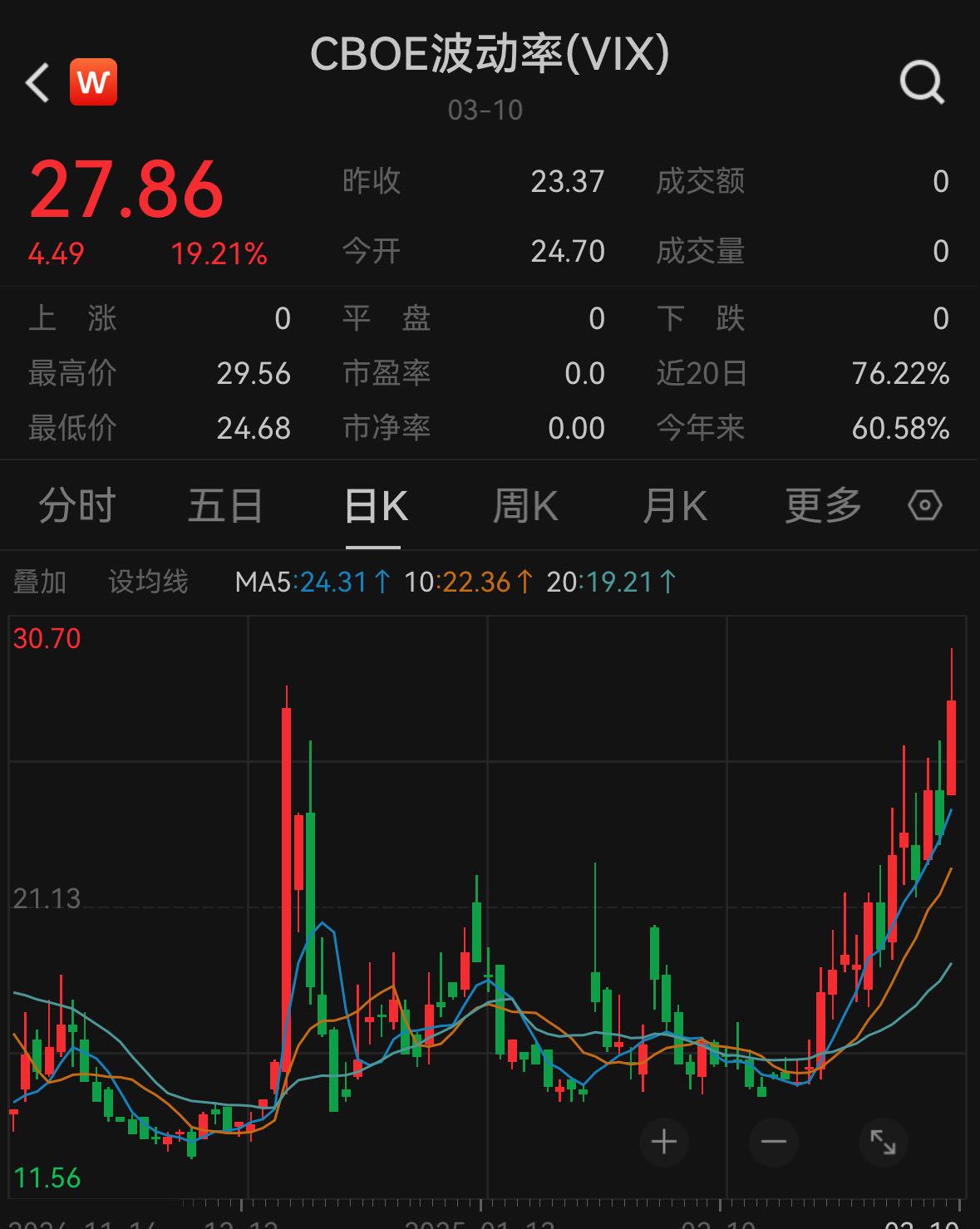 “恐慌指数”CBOE波动率指数(VIX)飙升19.21%至27.86点,触及2024年8月以来的最高收盘点位。10年期美国国债收益率下跌8个基点至4.22%。