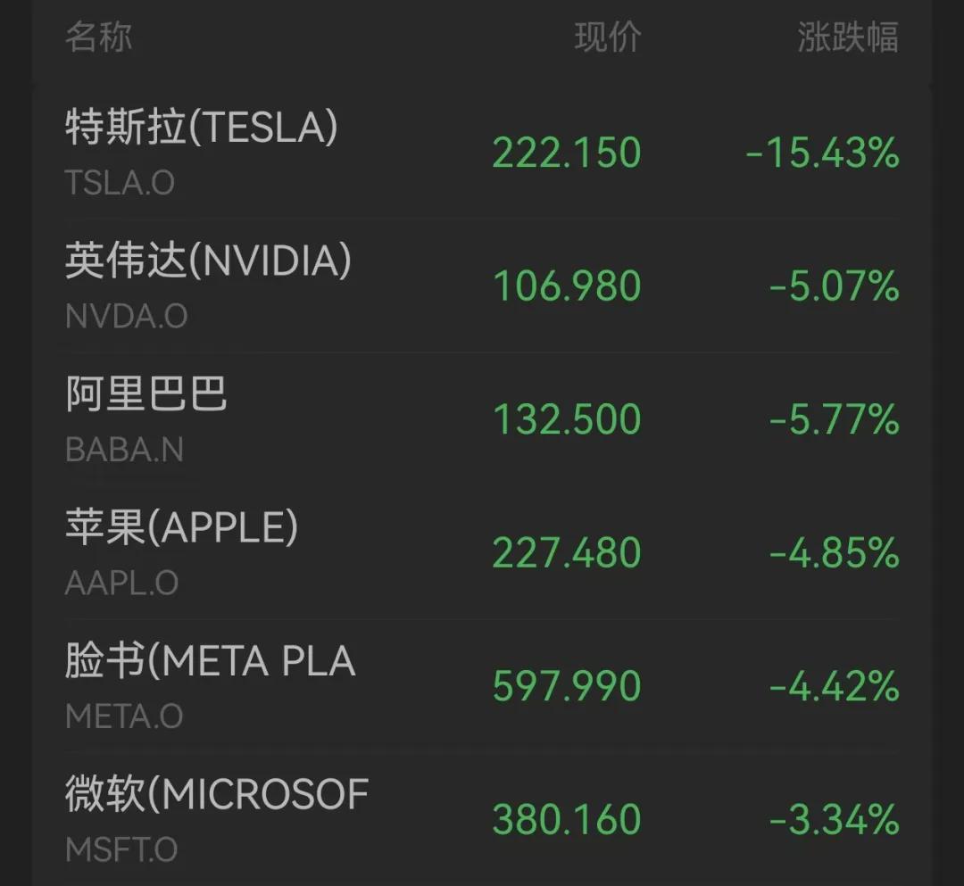 截至收盘,道指跌2.08%,纳指跌4%,标普500指数跌2.7%,大型科技股普跌,特斯拉跌超15%,为2020年9月以来最大单日跌幅,英伟达跌超5%,苹果、Meta、谷歌跌超4%,微软跌超3%。