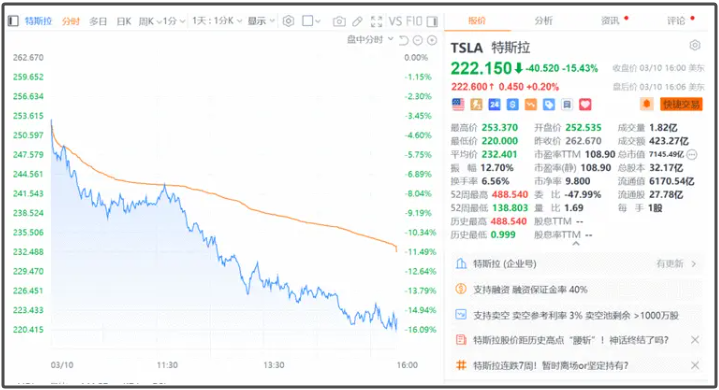 最惨的当属特斯拉,跌超15%,为2020年9月以来最大单日跌幅,市值一夜蒸发1303亿美元(约合人民币9459亿元),当前股价较历史高点已遭“腰斩”。