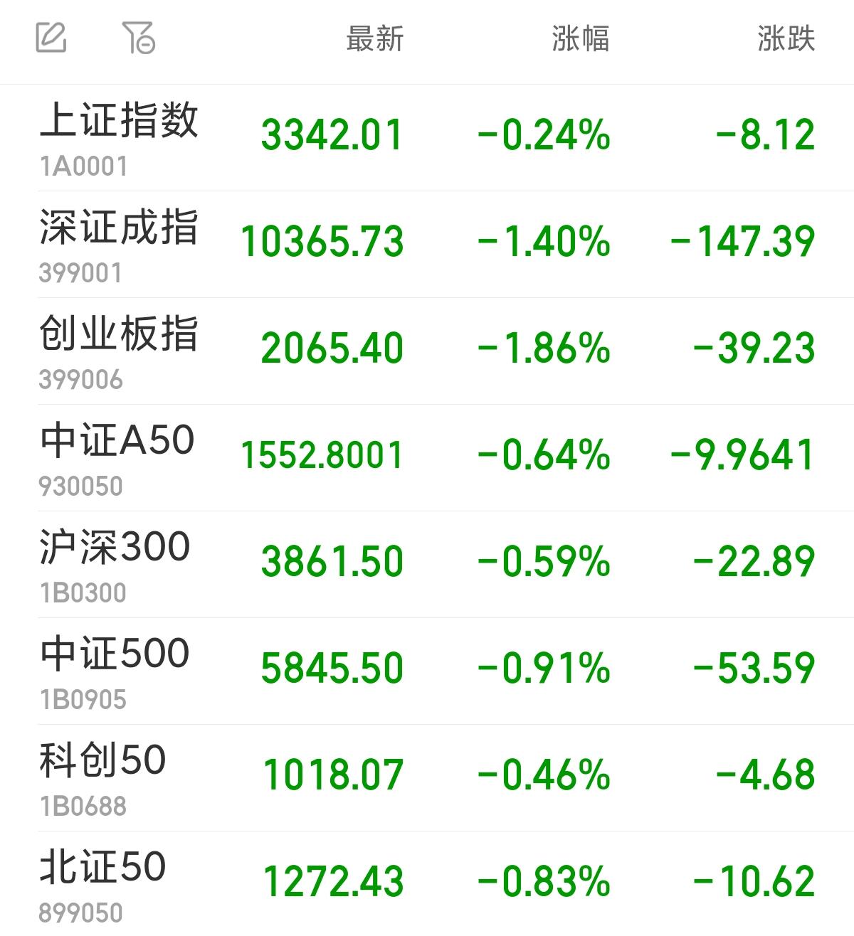 中新经纬4月3日电 周四,A股三大指数集体下跌。截至收盘,上证指数跌0.24%,报3342.01点;深证成指跌1.40%,报10365.73点;创业板指跌1.86%,报2065.40点。