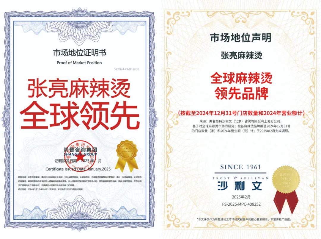 近日,张亮麻辣烫被权威咨询机构尚普和沙利文授予了全球领先麻辣烫品牌市场地位认证。