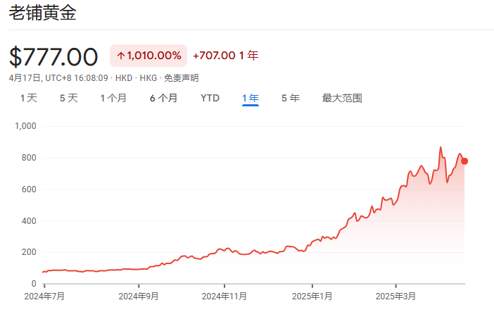 2025年4月1日,港股老铺黄金收盘价定格在868港元,市值逼近1500亿港元。