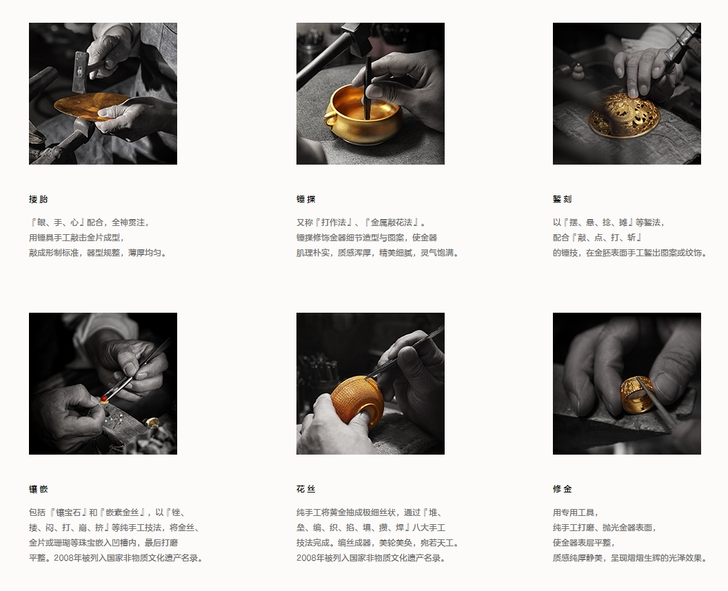 他将古代宫廷手工制作黄金的花丝、錾刻、锤揲等六大非遗技艺融入产品,使黄金彻底摆脱过去千篇一律的流水线工艺。