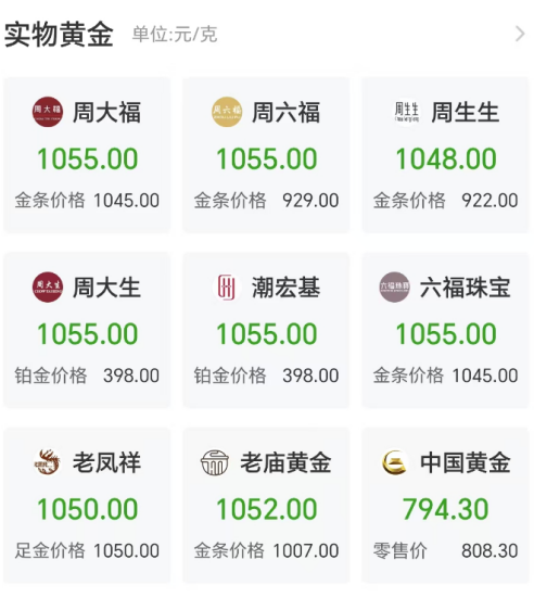 同时,国内多品牌金饰价格也开始回落,其中周生生足金饰品标价1048元每克,较前一日下调32元每克,日涨跌幅最高。