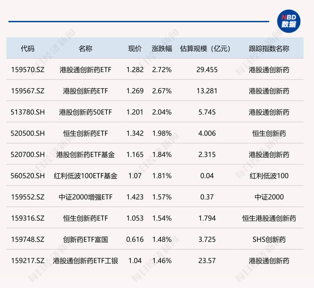ETF涨跌幅方面,多只港股创新药相关ETF涨超2%。