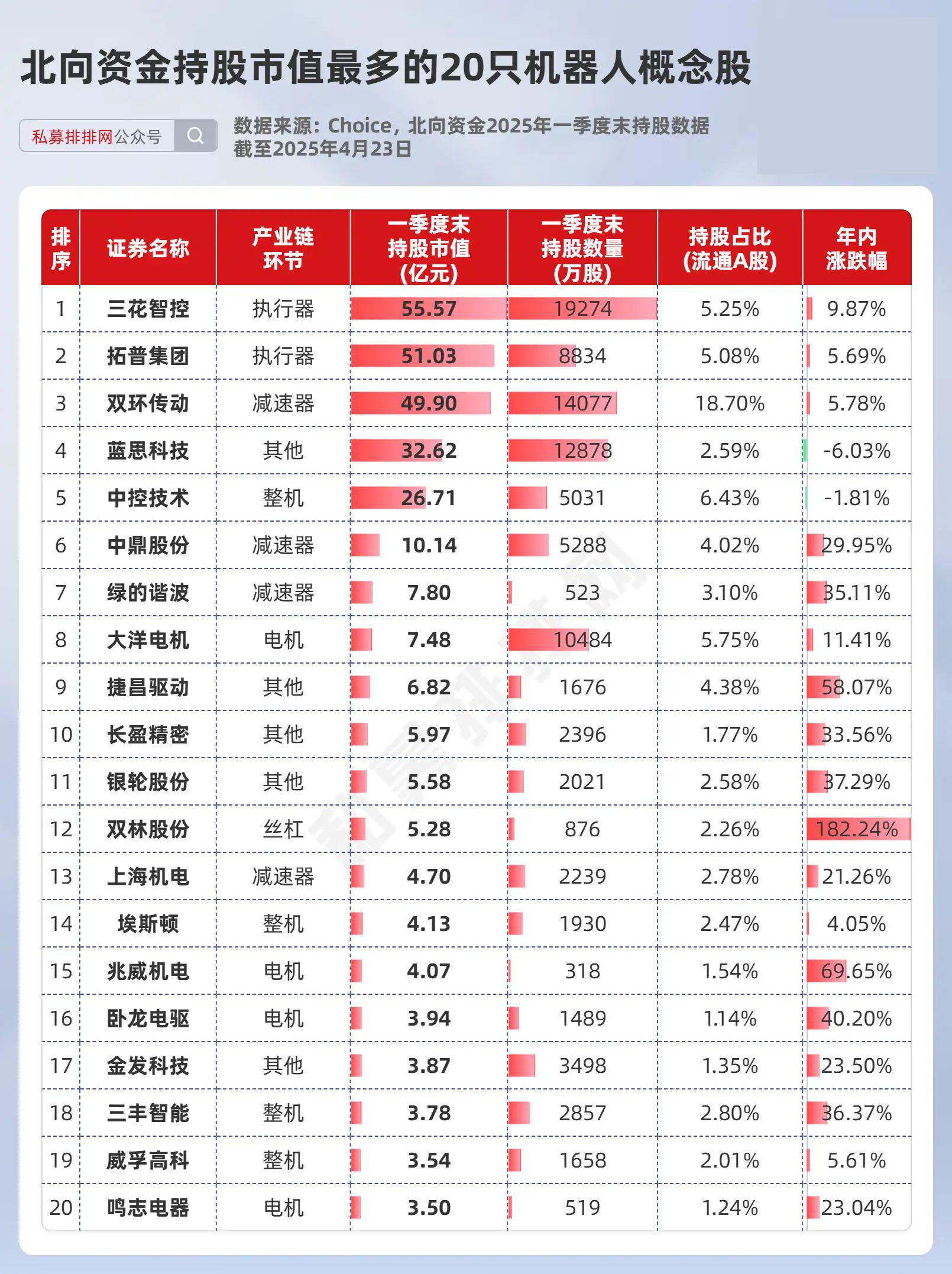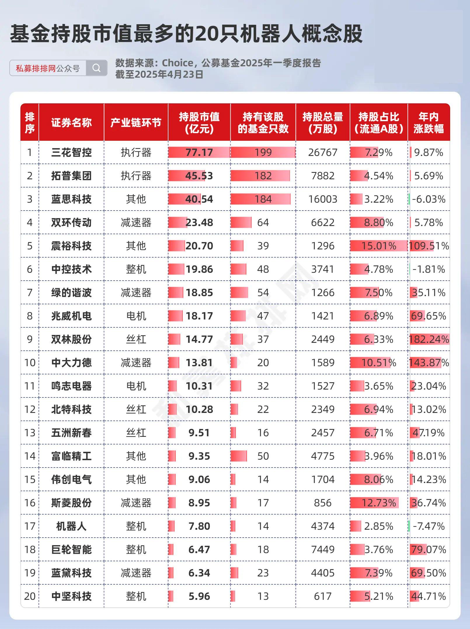 为了给读者提供一些参考,笔者梳理出了2025年一季度末公募基金持股市值最多的20只机器人概念股。其中13只机器人概念股被公募基金持股超10亿元,6只被基金重仓的机器人概念股年内涨幅已超50%。