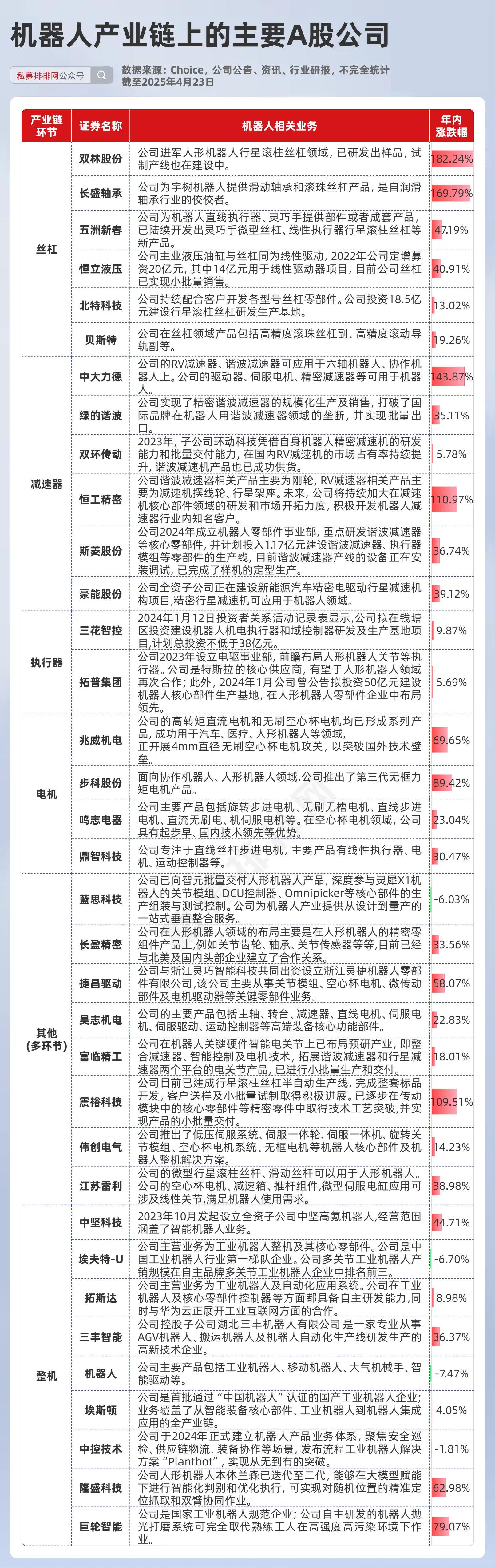 机器人作为未来产业,不少券商分析师认为,当前的机器人产业链有望复刻2020-2021年的新能源车产业链的演绎路径。笔者根据公司公告、公司资讯、行业研究报告等梳理出了机器人产业链上的主要A股公司,供大家参考。其中,截至4月23日收盘,双林股份、长盛轴承、中大力德、恒工精密、震裕科技等多股在年内已经实现股价翻倍。