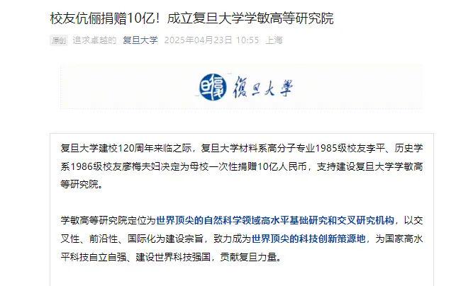 4月23日,复旦大学微信公众号消息,校友李平、廖梅夫妇,为母校一次性捐赠10亿人民币,支持建设复旦大学学敏高等研究院。