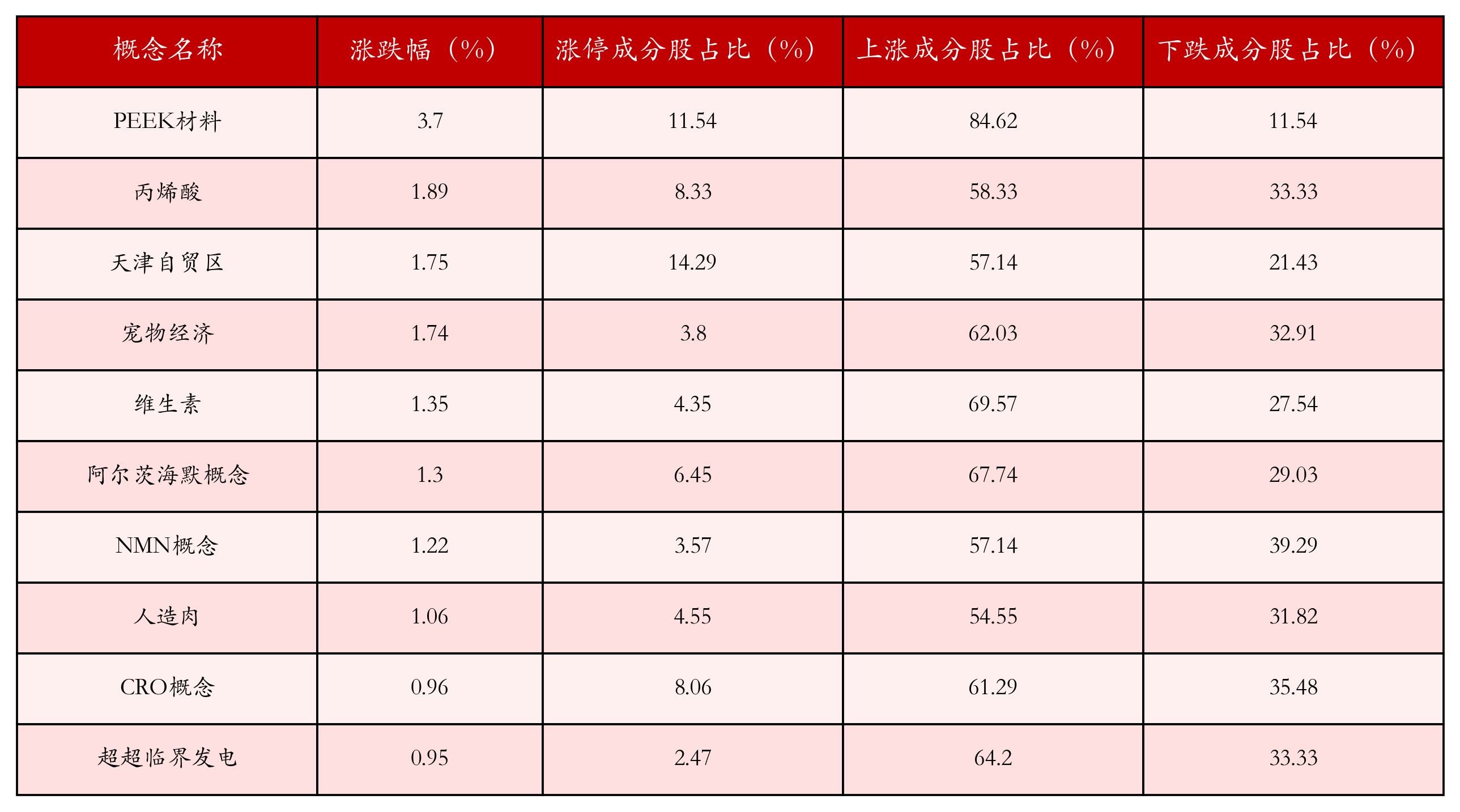 根据A股概念涨跌幅与所对应的股票池综合分析,涨幅靠前的三个概念板块分别为:PEEK材料、丙烯酸与天津自贸区。排名前10位的概念板块相关数据见下表: