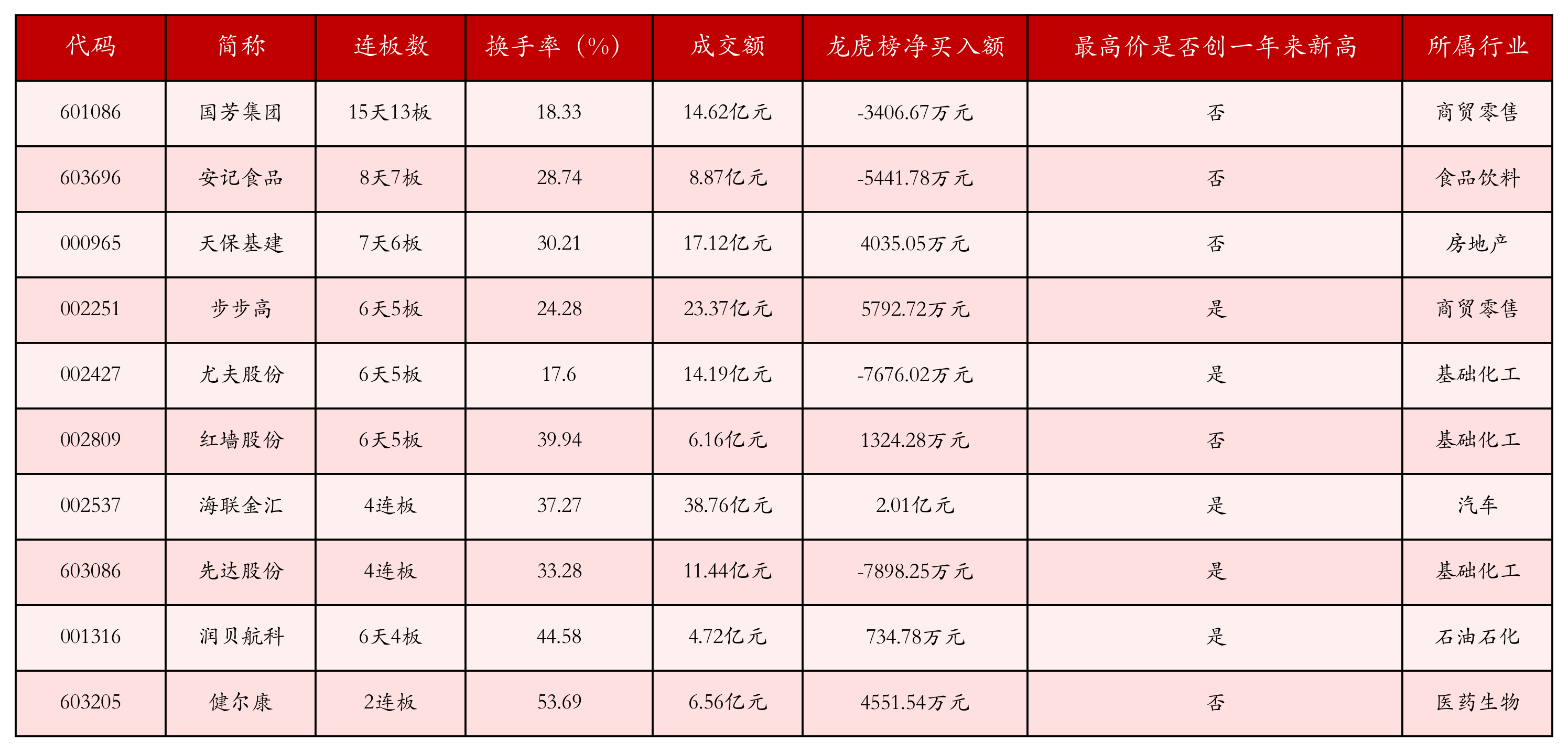 截至4月24日收盘,上证综指上涨0.03%,收于3297.29点,深证成指下跌0.58%,收于9878.32点,创业板指下跌0.68%,收于1935.86点。今日沪深两市A股共计64只涨停,综合当前连板数以及当日龙虎榜数据,其中较为强势的前三只个股分别为:国芳集团(601086)、安记食品(603696)与天保基建(000965)。今日强势个股前10位具体数据见下表: