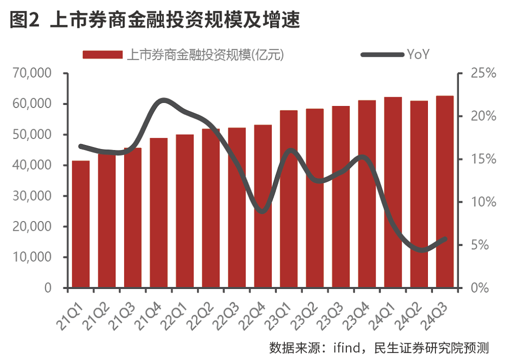 截至2024年三季度末,44家上市券商金融投资规模达到6.27万亿元,同比增长5.7%。尽管近年来在聚焦主业与集约化发展导向下,券商净资产与自营杠杆增速有所放缓,但在行业整体业绩企稳叠加市场热度回暖的背景下,未来金融投资增速有望保持稳定,假设金融投资季度环比增速保持在1.4%左右(近1年环比增速均值),综合来看,预计2024年四季度、2025年一季度自营投资收入同比分别增长51%、35%。