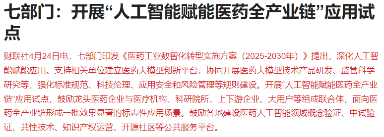 七部门印发《医药工业数智化转型实施方案(2025-2030年)》提出,深化人工智能赋能应用。支持相关单位建立医药大模型创新平台,协同开展医药大模型技术产品研发、监管科学研究等,强化标准规范、科技伦理、应用安全和风险管理等规则建设。