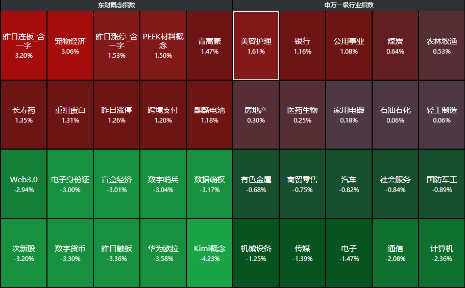 分行业来看,美容护理、银行、公用事业、煤炭等行业领涨,计算机、通信、电子、传媒、机械设备等行业领跌。