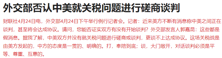 关于特朗普提到的关税降温,外交部也做出了回应,否认了中美就关税问题进行磋商谈判。
