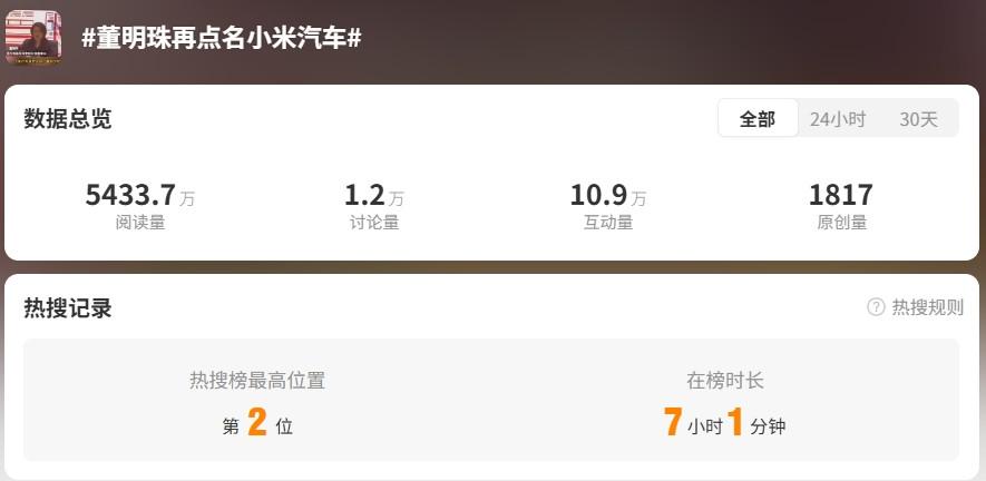 4月23日,话题“董明珠再点名小米汽车”冲上微博热搜高位,引发网友热议。截止到4月24日上午,该话题的阅读量已突破5433万,讨论量、互动量也已分别突破1万、10万大关。