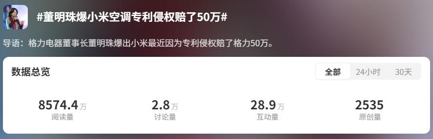 2024年12月,一个名为“董明珠爆小米空调专利侵权赔了50万”的词条在微博上爆火。时至今日,该话题的阅读量已经突破8574万,讨论量和互动量更是分别突破了2万、28万。