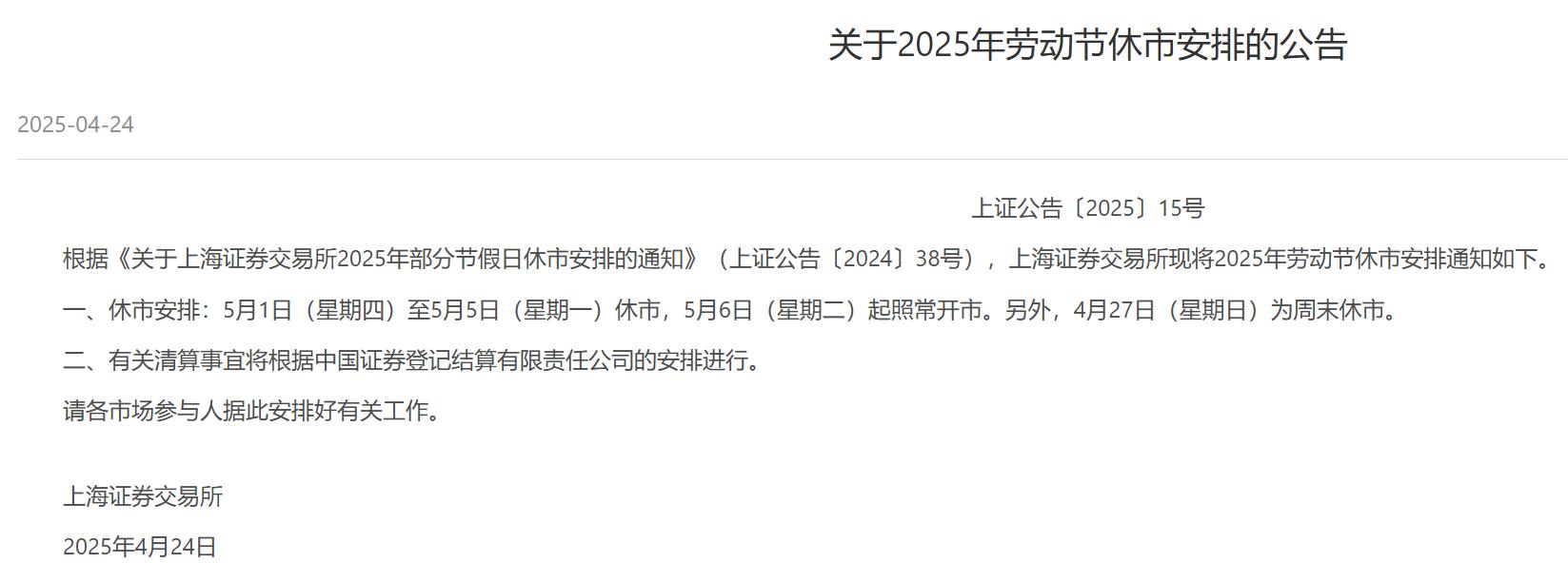 上交所、深交所当天还发布了2025年劳动节、佛诞日期间沪港通下港股通交易日安排的通知。