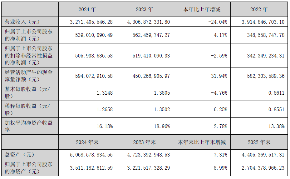 姚记科技年报显示,公司2024年实现营业收入32.71亿元,较2023年的43.07亿元,同比下降24.04%,减少金额超10亿元;归母净利润5.39亿元,同比下降4.17%;扣非净利润5.06亿元,同比下降2.59%。