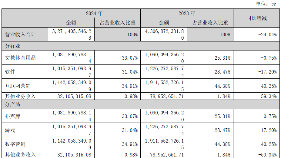 目前,姚记科技的主业包括移动游戏、扑克牌和数字营销等3部分。财报显示,公司在2024年期间,移动游戏和数字营销两项业务上下滑明显。其中,游戏业务去年营收10.15亿元,同比下滑17.20%;数字营销去年营收11.42亿元,同比下滑40.25%。此外,扑克牌业务去年营收10.82亿元,与上期基本持平。