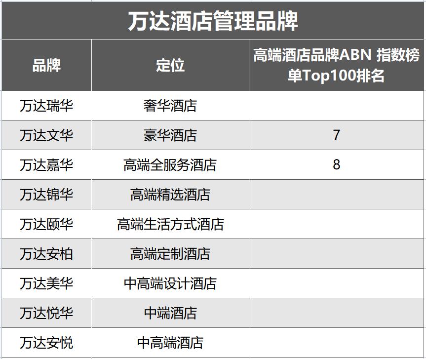 万达酒店管理拥有9个品牌酒店,具体如下表。9大品牌除了万达悦华之外,均是高端酒店,其中,万达文华酒店和万达嘉华酒店上榜2024年度国内高端酒店品牌ABN指数榜单Top100,位居第7和第8位。公开资料显示,截至2024年底,万达酒店管理公司在国内200多个城市拥有在营酒店共计204家,客房总量超过40200间,另有376家酒店已签约待开业。