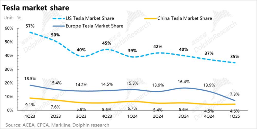 有数据显示,特斯拉在美国的市占率,从2023年的57%,降至今年一季度的35%;同期,特斯拉在欧洲市占率从18.5%断崖式暴跌至7.3%,在中国市占率从9.1%降至4.6%。