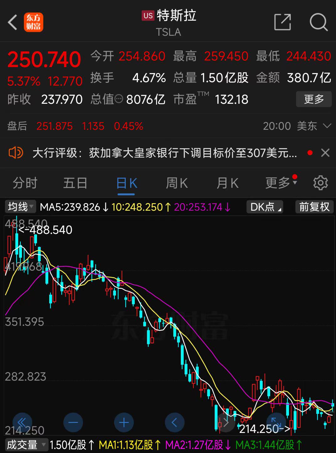 让人大跌眼镜的是,仅仅过了短短五个月,特斯拉股价就大跌,如今股价跌至250美元出头,市值也只剩下8056亿美元,被“万亿美元俱乐部”除名。