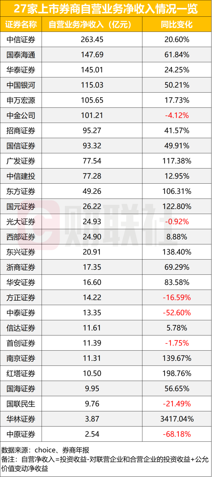 数据显示,目前上市券商自营业务收入排名前十的券商是中信证券(263.45亿元)、国泰海通证券(147.69亿元)、华泰证券(145.01亿元)、银河证券(115.03亿元)、申万宏源证券(105.65亿元)、中金公司(101.21亿元)、招商证券(95.27亿元)、国信证券(93.32 亿元)、广发证券(77.54亿元)、中信建投证券(77.28 亿元)。