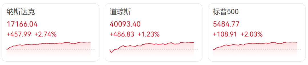 截至收盘,道指上涨486.83点,报40093.40点,涨幅1.23%;标普500指数上涨108.91点,报5484.77点,涨幅2.03%;纳指涨幅达2.74%,报17166.04点。
