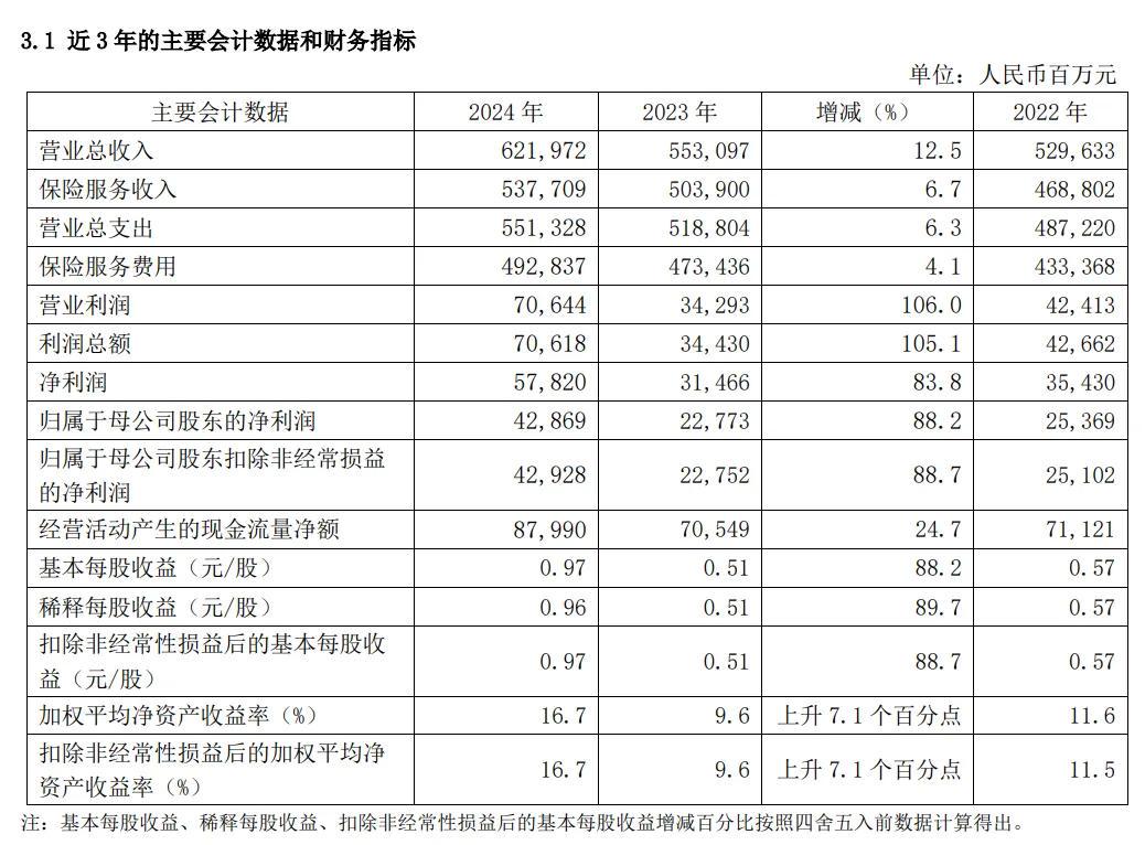 根据2024年年报摘要,截至2024年末,集团实现营业总收入6220亿元,同比增长12.5%;实现保险服务收入5377.09亿元,同比增长6.7%;净利润578.2亿元,同比增长83.8%;归母净利润428.69亿元,同比增长88.2%。