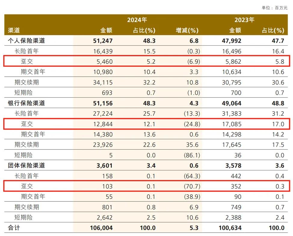 横向对比,在2024年,三渠道期缴续期保费分别同比增长了10.8%、35.6%、6.9%。相反,同期个险渠道、银保渠道、团险渠道的长险首年保费同比分别下降了0.3%、13.3%、64.3%,趸交型产品保费分别同比下降了6.9%、24.8%、70.7%。