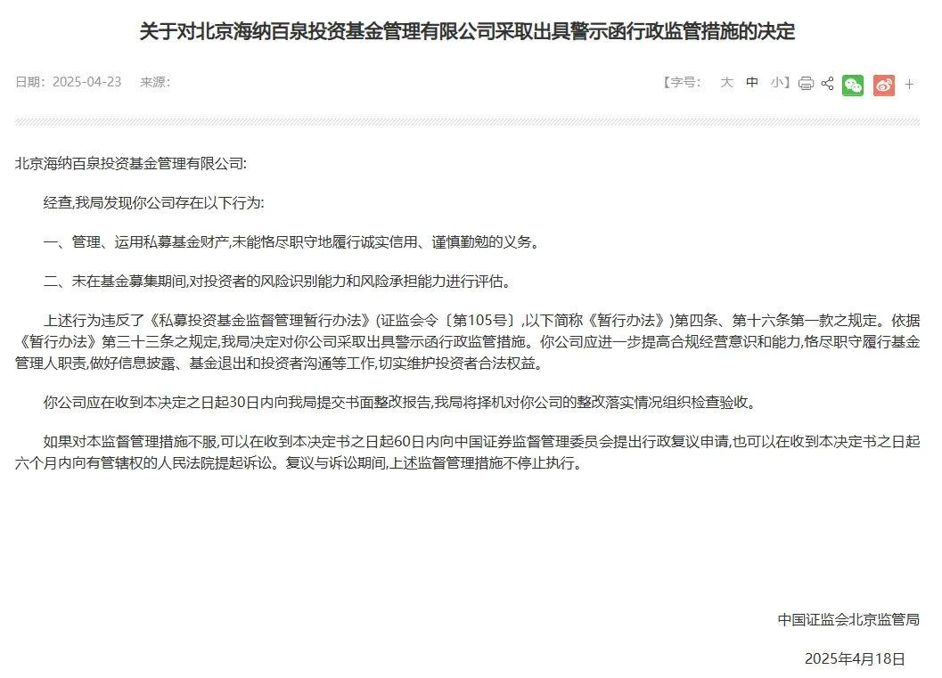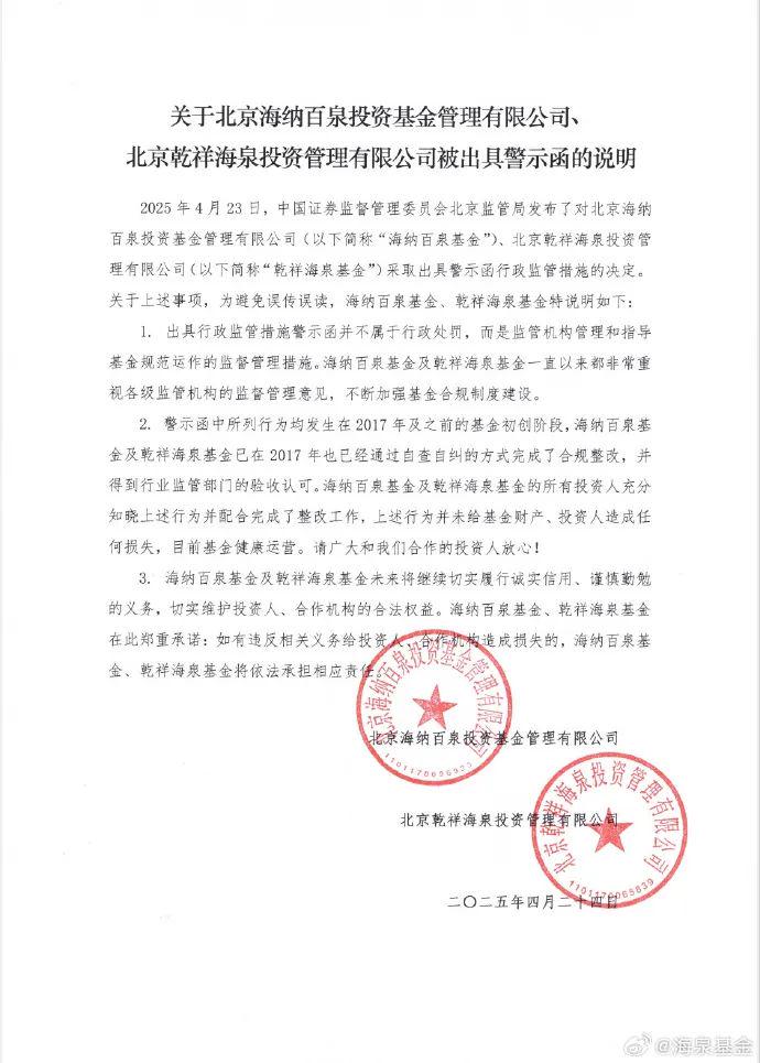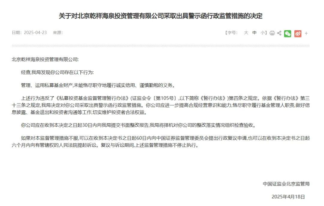 北京证监局官网4月23日披露的信息显示,北京证监局于4月18日对海纳百泉基金和乾祥海泉投资采取出具警示函行政监管措施的决定。