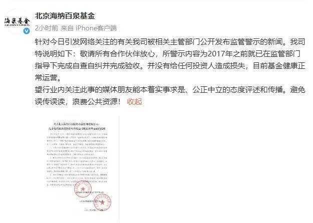 4月24日下午,针对上述引发网络关注的事件,海纳百泉基金官方微博发文称:“敬请所有合作伙伴放心,所警示内容为2017年之前就已在监管部门指导下完成自查自纠并完成验收。并没有给任何投资人造成损失,目前基金健康正常运营。”
