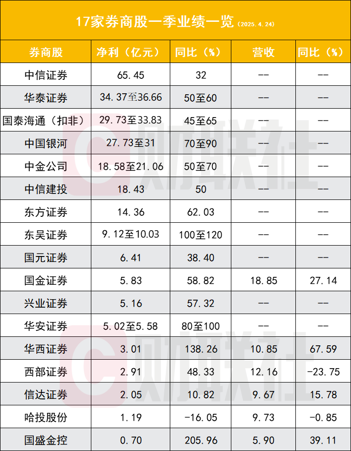 财联社4月25日讯(记者高艳云)截至4月24日,6家券商股披露了2025年第一季度财报,结合前期已发布的业绩预报与快报,总计已有17家券商股公布一季度经营成果。