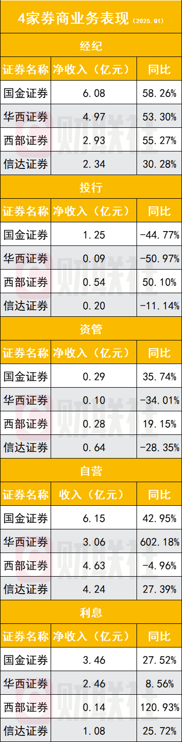 就4家数据可比券商来看,即国金证券、华西证券、西部证券、信达证券,具体情况如下: