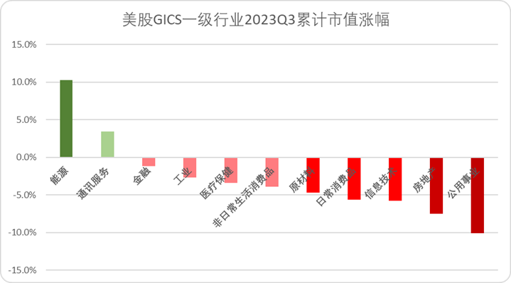 在经历了两个季度的价值重估后,美股23年三季度经历了一波震荡,三大指数均小幅度回调。从行业层面来看,11个大行业中仅有两个行业上涨,分别为能源和通讯服务。