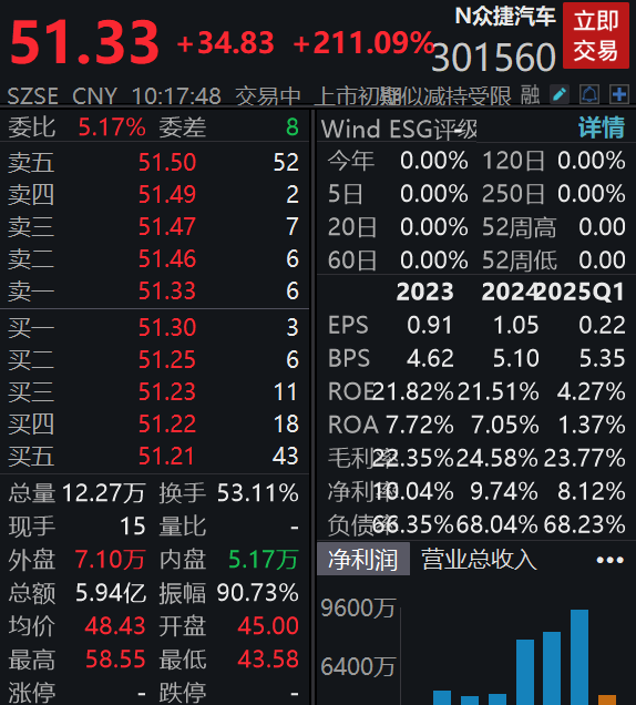 4月25日,新股N众捷一度涨超240%,触发临时停牌。截至发稿,该股涨211%,报51.33元,成交额5.94亿元。