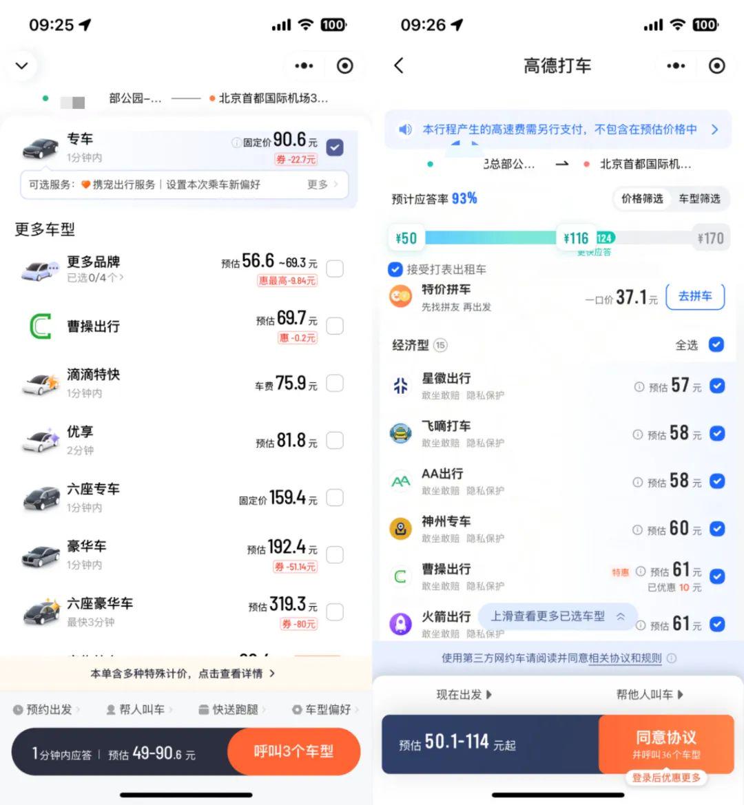 财视传播留意到,在滴滴、高德上打车,顾客可以选择同时叫其他平台的司机,在高德上叫车直接就是多个平台的车源。如果说高德自营的网约车平台“火箭出行”车源不够需要补充的话,那么作为行业龙头的滴滴也为部分友商开放了订单。据财视传播亲测,用滴滴在北京叫车,就可以勾选同时叫首汽约车、花小猪正价版、飞嘀打车、阳光出行等平台的车辆。