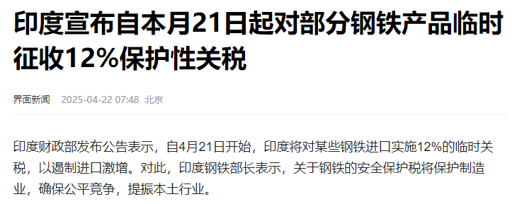 前几天印度宣布,将对部分钢铁产品临时加征12%的保护性关税,以遏制进口激增,时间是200天。
