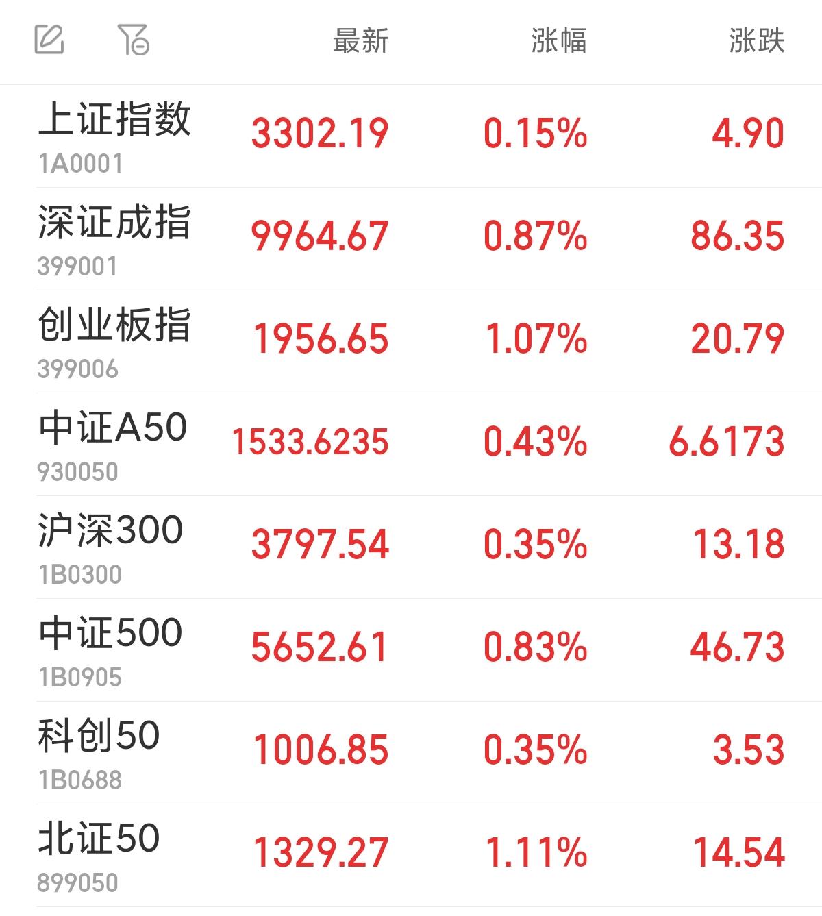 中新经纬4月25日电 周五早盘,A股三大指数高开高走。截至午间收盘,上证指数涨0.15%,报3302.19点;深证成指涨0.87%,报9964.67点;创业板指涨1.07%,报1956.65点。