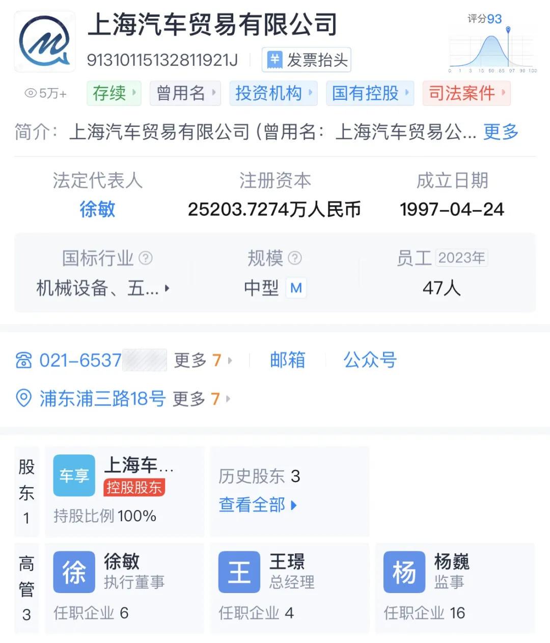 资料显示,上海汽车贸易有限公司成立于1997年4月,位于上海市浦东新区,企业注册实缴资本25203.7万人民币。股权架构显示,上海汽车贸易有限公司由上海车享科技产业有限公司全资持股,而上海车享科技产业有限公司由上海汽车工业销售有限公司全资持股,上海汽车工业销售有限公司又是上海汽车集团股份有限公司全资控股子公司。也就是说,上海汽车贸易有限公司是上海汽车集团股份有限公司旗下曾孙公司,也是上汽集团的间接控股公司之一。