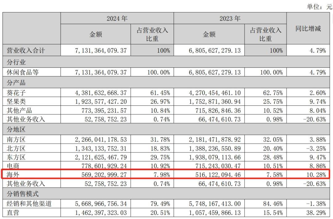 与此同时,洽洽作为国内率先出海的零食品牌,国际化战略稳步推进,目前洽洽的瓜子坚果已经出口到越南、马来西亚、美国、加拿大等国家。2024年,洽洽海外营业额5.69亿元,同比增长10.28%。